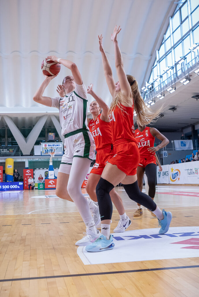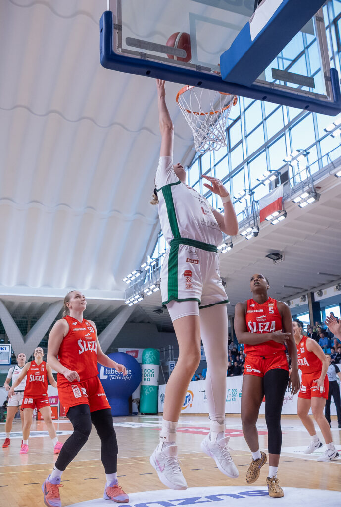 Pierwsze punkty w meczu zdobyła rzutem z wyskoku z półdystansu Robbi Ryan. Amerykanka skorzystała z zasłony Markeishy Gatling gubiąc broniącą ją Vihmane. Pomóc próbowała wychodząca z pomalowanego Davis, jednak rzut kapitan Biało-Zielonych był zbyt szybki. Błyskawicznie punktami odpowiedziała Strautmane, która bez wymiany podania zaatakowała w prawo, blisko linii końcowej odpychając Kamilę Borkowską i zdobywając punkty wysokim rzutem o tablice. W naszej zapowiedzi pisaliśmy o tym, jak ważną rolę w grze Ślęzy odgrywa gra z kontry i drużyna rywalek nie kazała nam długo czekać, aby tego doświadczyć. W odpowiedzi za 3 trafiła świetnie dysponowana ostatnio Klaudia Wnorowska. Po tym jak do pomalowanego z piłką w rękach zbliżyła się Williams, trójka obrońców Ślęzy jak przyciągające się magnesy otoczyły Amerykankę. Ta jednak przytomnie oddała piłkę do gotowej do oddania rzutu Klaudii. Kolejne posiadania Biało-Zielonych, chociaż nie przynosiły punktów, napawały optymizmem. Od pierwszych minut Lublinianki dominowały w zbiórce, czy to zabezpieczając piłkę po stronie bronionej, czy ponawiając akcje po atakowanej. To właśnie po takim ponowieniu padły kolejne punkty; po niecelnym rzucie Kamili Borkowskiej piłkę zebrała Ryan. Amerykanka wspólnie z polską środkową zagrały dwójkowo, Ryan wykorzystała odrobinę przestrzeni do rzutu i do wyniku zespołu dopisała kolejne 3 punkty.