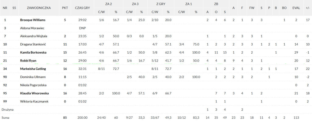 Nie można naturalnie nie wyróżnić znakomitych występów indywidualnych. Najwięcej w drużynie, po 16 punktów, rzuciły Markeisha Gatling i Klaudia Wnorowska. Keisha dołożyła do tego 2 zbiórki i 2 asysty, Klaudia 7 zbiórek i 3 asysty. Imponujące double-double zapisała na swoim koncie Kamila Borkowska, autorka 15 punktów i 15 zbiórek. Znakomite 12 punktów, 8 zbiórek i 9 asyst zanotowała kapitan Robbi Ryan.