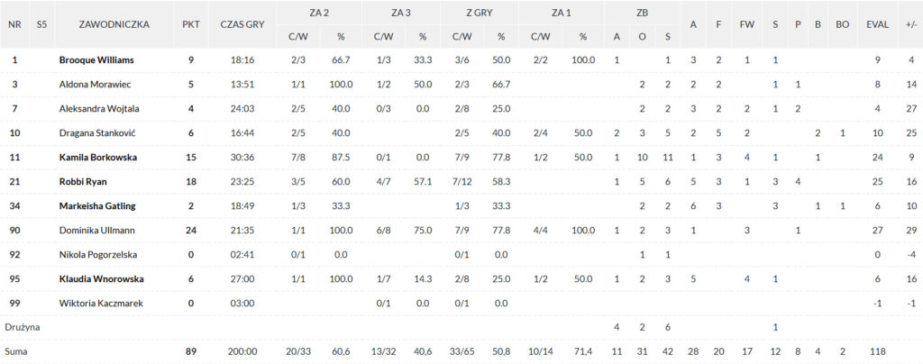 Mówiąc o występach indywidualnych naturalnie nie sposób nie wspomnieć o znakomitych 24 punktach Dominiki Ullmann, która mecz skończyła trafiając 7 z 9 rzutów z gry. 18 punktów, w tym 4 trójki dołożyła Ryan, która ponadto rozdała 5 asyst i zebrała 6 piłek. Kolejne już double-double zapisała na swoim koncie Kamila Borkowska, zdobywczyni 15 punktów i 11 zbiórek. Świetnie ze swoich zadań wywiązała się cała drużyna, więc chciałoby się wymienić wszystkie zawodniczki. Ponieważ na taką ekstrawagancję nie możemy sobie pozwolić, wspomnimy jeszcze tylko Olę Wojtalę. Chociaż 4 punkty, 2 zbiórki i 3 asysty na pierwszy rzut oka nie wyglądają ekscytująco, rozgrywająca odegrała ogromną rolę w odniesieniu wczorajszego zwycięstwa. Miłośników statystyk odesłać możemy do parametru plus/minus, który w przypadku Polki wyniósł +27 w czasie 24 minut spędzonych na parkiecie.
